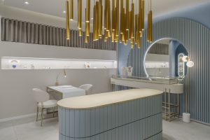 Para conferir personalidade ao espaço funcional, as profissionais apostam numa paleta ousada. Aos tons neutros, clássicos nas joalherias mais renomadas do mundo, elas adicionam uma bela sobreposição de tons azuis. O destaque fica para a imponência dos MDFs, lançamentos Sudati que contrastam diferentes nuances da cor. Os padrões são inspirados nas praias, trazendo a atmosfera da natureza para o ambiente interno.