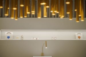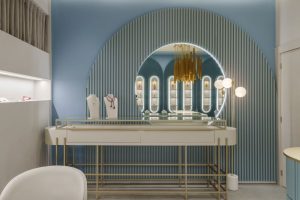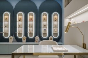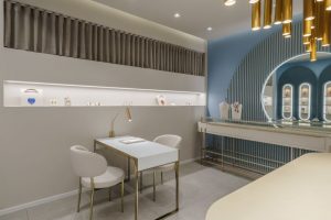 A composição de cores é o ponto focal do projeto, pois uniformiza o espaço e valoriza o brilho das joias. A paleta vai de encontro ao tema da 28ª edição da mostra paranaense, o “Infinito Particular”, que prima por ambientes de bem-estar, equilíbrio e conforto. Sensações, estas, estimuladas pelo azul. A cor também transmite confiança, segurança e profissionalismo – necessárias para a imagem de um estabelecimento comercial.