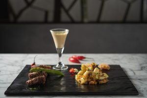 “A entrada de couscous marroquino e babaganoush veio do capítulo “jantar entre amigos” (pag.103) onde o autor cita o preparo do couscous marroquino e, pouco antes, narra uma cena bastante intensa, o que inclusive originou o nome do prato. Quis trazer a “sedução” através do vinagrete de morangos que, além de ser a “descoberta” do prato, a fruta em si traduz com maestria essa mensagem.