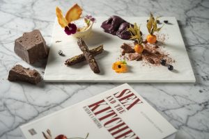 Em diferentes momentos do livro o chocolate vem à tona, inclusive ganha presença em título de capítulo como “a vida continua, porém com chocolate” e “eu só quero chocolate!”. Neste último os personagens estão em um bar de tapas espanholas e desfrutam de uma sobremesa típica da região de Galícia, na Espanha, chamada Torta de Santiago. Porém, para fazer uma remissão ao chocolate e a cultura espanhola, que também temos no DNA do nosso hotel, trouxe o creme Catalão (ou crema catalana) acompanhado de chocolate em forma de brochette e um delicioso sorvete de mirtilo para completar o “cariño” ao paladar”.