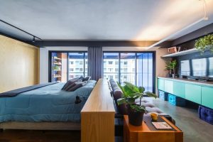 O charme desse trecho está no colorido da marcenaria, laqueada com três nuances de verde, pensadas para fazer par com o azul maciço do terraço, parte da fachada do prédio. “A ideia era proporcionar uma linguagem contínua. Num imóvel compacto, é melhor evitar muitos elementos diferentes”, ensina Zé Guilherme. Essa uniformidade é reforçada pelo cinza, onipresente no revestimento cimentício do chão ao teto. Como terceiro material, surge a acolhedora madeira: o pínus foi a espécie escolhida para compor o guarda-roupa, volume de destaque na face oposta, na ala do dormitório.