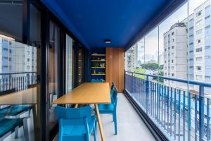 Aproveitada em cada centímetro, a varanda concentra mesa de jantar, estante para livros, máquina de lavar roupas e até o refrigerador de ar, aparelhos escondidos atrás de insuspeitos painéis. “É um espaço social, mas também lavanderia. Tudo junto e organizado”.