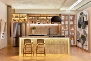 A Casa Relax, projetada pelo arquiteto Rodrigo Barbosa, foi criada como um refúgio para um morador cosmopolita, apreciador de arte moderna e design. A área gourmet apresenta a linha Essential da Ornare, com design minimalista e alta funcionalidade. As frentes lisas e os acabamentos versáteis criam um ambiente equilibrado e atemporal. O Wall System organiza o espaço com nichos e prateleiras, oferecendo ampla área de armazenamento e exposição de objetos. Os acabamentos neutros reforçam a estética contemporânea, criando uma atmosfera acolhedora.