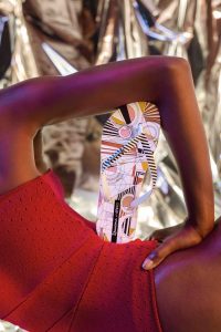 A estilista Thaissa Becho, que tem sua marca homônima de moda praia com referências dos anos 80, pensou no movimento como algo que pode ser admirado por diferentes ângulos, como na geometria, tão presente nas suas estampas. Para ela, o verão tem o poder de renovar nossa força e votos de auto aceitação, onde mulheres que se amam ganham espaço nessa desconstrução do mundo que, na sua opinião, é tão necessária.
