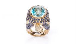 Anel Frattina & TXAI em ouro amarelo com topázio azul, safiras e diamantes incolores
