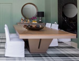 Na primeira participação de Mauricio Christen e Claudio Schramm na Mostra Artefacto, a dupla entrega um living com jantar de 40 metros quadrados. Com as paredes quase todas revestidas em madeira, os tecidos estabelecem elegante harmonia junto aos quadros e lembranças de um colecionador experiente. Os profissionais atuam com design de interiores tanto para residenciais quanto corporativos e contam com trabalhos espalhados por todo o Brasil e também no exterior em países como Estados Unidos, Itália, Suécia, África do Sul, Panamá, Bolívia, Equador e até uma loja no Cazaquistão. “Nosso foco é que o projeto seja a definição da essência do cliente”, declaram. A poltrona com puff Desert em camurça e couro e as mesas laterais Croma são os destaques da composição de shape elegante e sob medida.