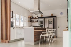 Na residência em um condomínio de campo, o designer de interiores Henrique Freneda expressou o estilo colonial no desenho que compõe a marcenaria branca da cozinha. Toques de madeira natural marcam presença na ilha central e no detalhe ripado | Foto: GN Produtora