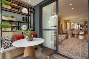 A linearidade da integração desse projeto une cozinha, sala de estar, jantar e a varanda do apartamento. Proporcionando ao espaço externo os mesmos conceitos de décor do interior, esse ambiente se torna mais aconchegante e coerente com os outros ambientes da residência. Destaque vai para estante, em conceito biofílico.
