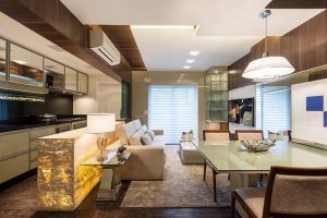 Nesse projeto, a arquiteta integrou o primeiro pavimento inteiro do duplex. O grande destaque vai para a bancada de mármore retroiluminado, que permite uma divisão funcional entra a sala e a cozinha, mas mantém a integração e visibilidade de todo ambiente, proporcionando mais personalidade e sofisticação à residência.