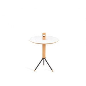 Tampo em MDF lâmina de alta pressão branco. Torneado em madeira maciça. Base em aço pintado preto. (ø 40 x 57 cm)