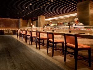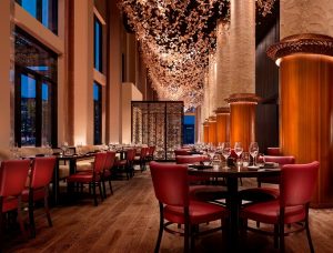 Parte da cultura de marca, as experiências gastronômicas exclusivas não poderiam ficar de fora. Logo no térreo, o restaurante Nobu Chicago irá levar seus sentidos para outro patamar. Com pé direito alto, arte contemporânea dramática, texturas impressionantes e cores fortes, o restaurante exibe uma decoração de encher os olhos como, por exemplo, as colunas de dois andares inspiradas em espadas samurais antigas, as paredes em tons de areia que lembram papel amassado de origami e peças de arte personalizadas do artista holandês Noor van Spaendonck.