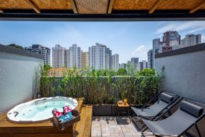 Destaque do projeto, a laje foi transformada em uma cobertura dos sonhos, com direito a spa com hidromassagem e deck de madeira. Foto: Bicubico
