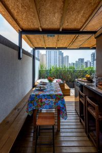 Completa, a cobertura conta com um cantinho para a churrasqueira, horta e mesa para refeições protegida por uma estrutura de metal e madeira. Foto: Bicubico