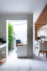 Como não poderia faltar, o estar contou também com um home-office especial, alocado onde antes havia uma pequena área de serviço. “Derrubamos a parede, tiramos a porta e nivelamos o piso, integrando-a com o restante da casa”, afirma Scarpato. O pilar estrutural que não pode ser retirado acabou por ajudar a delimitar o espaço e a iluminação zenital, permitida através de um teto de vidro, trouxe toda luz natural necessária para o andar térreo. Para complementar, um vistoso jardim vertical com espécies tropicais trouxe o frescor do verde para dentro de casa.