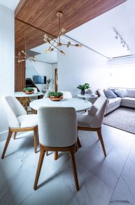 Favorecendo a integração visual dos ambientes com dimensões reduzidas, todo o mobiliário escolhido segue a mesma paleta de cores, com predominância do tom claro, e suas formas e quinas mais arredondadas suavizam o décor, garantindo também uma circulação mais segura.