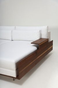 Suas peças se destacam por seu desenho limpo e estilo minimalista, onde os móveis apresentam silhuetas finas e elegantes. No sofá Aruanã, a base de MDF e os pés em aço carbono se destacam trazendo leveza à estrutura mais robusta e acolhedora. Com múltiplas opções de montagem, os módulos – com braço ou sem – proporcionais concedem o mesmo diálogo entre os elementos e o todo, dando dinamismo aos mais diferentes layouts.