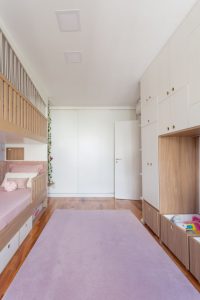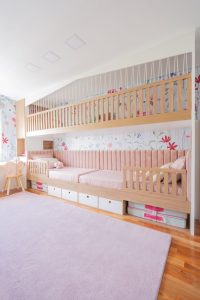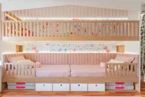 O diferencial é o design da cama beliche. Desenhado pela própria arquiteta que aproveitou a parede lateral de 5 metros de comprimento para criar uma grande casa alusiva à casa na árvore. As duas camas ficam no primeiro nível da “beliche”, para que as irmãs mantenham uma conexão e fiquem próximas, porém cada uma com seu lado próprio a assim mantendo mais espaço no quarto. Acima das camas, no segundo nível um espaço para brincar de casinha ou cabaninha que também pode receber amigas para dormir. Abaixo da cama, a arquiteta aproveitou o espaço e criou gavetões para armazenar brinquedos e ainda um nicho de cada lado, para que cada uma pudesse ter seu colchão reserva para receber as amigas.