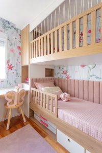 Além da criação dessa “grande” casa na árvore, a parte inferior, onde fica a cama das meninas, conta com uma cabeceira iluminada e nichos individuais que servem de apoio substituindo a mesa de cabeceira, que toma espaço no quarto, neste espaço há tomadas individuais, para que cada criança possa carregar seu celular, ipad e outros aparelhos eletrônicos. Todo o encosto da cama foi revestido com tecido em gomos de veludo na cor rosé.