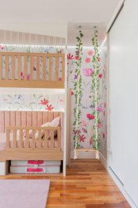 O grande destaque deste quarto é o balanço instalado ao lado da casa na árvore, projetando assim a atmosfera de uma floresta encantada. Com papel de parede floral e plantas entrelaçadas nas cordas do balanço, a peça remete a meninas aos contos de fadas e mundo do faz de conta.