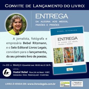 “Entrega – da alegria aos medos, paixões e prisões”, coletânea de poesias da jornalista, fotógrafa e empresária Bebel Ritzmann, será lançada no próximo dia 22 de março, no Hostel Bebel, em Curitiba.