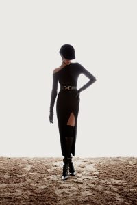 A nobreza e poder do animal ficam evidentes na família Doma, que faz alusão às cores contrastantes de um garboso cavalo castanho – um casaco de alfaiataria em tecido reciclado misto, levemente acinturado e com gola alta; e uma calça na mesma técnica e tecido, de modelagem reta e bolsos discretos na pala frontal. A composição dos tons de preto e marrom criam unidade enquanto ressaltam os detalhes ricos da construção da peça. O arremate fica por conta de um novo acessório, o cinto Elo, que se assemelha aos tradicionais bridões. O espetáculo de elegância e harmonia é evidenciado na família Dressage – uma homenagem a famosa “dança da equitação” onde cada passo, cada transição executada reflete a conexão profunda entre cavaleiro e montaria. Uma jaqueta em estilo aviador apresenta detalhes em veludo na frente e na pala das costas, com aplicação de pelos na gola, mangas e barra. Já a saia da mesma família possui frente sobreposta com uma linda barra assimétrica, aplicações de faixas com fivelas em metal dourado e cintura alta. O conjunto produz um look sofisticado que apresenta referências equestres de forma surpreendente.