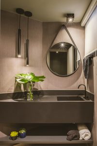 Não faltam novidades no mercado. Junto com o tradicional espelho liso, os projetos podem contar com espelho bisotado – com acabamento das bordas cortadas em ângulo –; moldura slim; redondos; quadrados; com iluminação frontal estilo camarim; formas orgânicas; natural; prata e fumê, entre outros modelos. “Gosto muito das peças com assinatura de design, como o Adnet. Sobretudo, os espelhos sem forma definida, com angulações não tradicionais têm ganhado protagonismo nos projetos de interiores”, detalha o arquiteto.