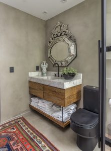 No amplo banheiro produzido pelo escritório Altera Arquitetura, o mix entre referências industriais, como o cimento queimado no piso e parede, madeira de demolição na bancada e o clássico espelho inspirado na era vitoriana | Foto: JP Image