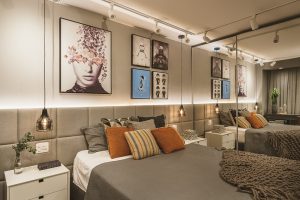 Espelhos no dormitório apoiam o décor no intuito de ampliar e, sem dúvidas, e auxiliar na rotina do morador. Portanto, é recomendado a especificação de um espelho alto, que permita a visualização da cabeça aos pés. Caso o projeto não ofereça uma parede para sua instalação, é possível considerar um espaço na marcenaria, como sua colocação em armários. Neste caso, o projeto precisa considerar o emprego de ferragens reforçadas, haja vista o peso da peça deixa a porta mais pesada, e a inclusão de puxadores camuflados e embutidos na porta, para que o usuário não precise apoiar as mãos e dedos no espelho. “Ninguém gosta de um espelho manchado”, destaca Renan.