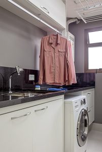 Além dos armários, uma bancada de serviço também é imprescindível. É nesta área de apoio que o morador ou a funcionária do lar podem deixar as roupas limpas após tirá-las da máquina ou para passá-las. “Na sequência do tanque, podemos estender para conceber uma área plana ou até mesmo apostar em soluções de tampas retas que criam uma bancada móvel, escondendo a saída de água”, indica a arquiteta.