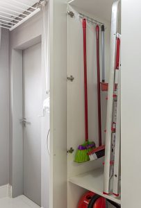 Com a marcenaria planejada, o projeto de Cristiane Schiavoni dedicou uma abertura específica para receber vassouras, rodos, pá de lixo e escada. Na parte inferior, o aspirador de pó | Foto: Carlos Piratininga