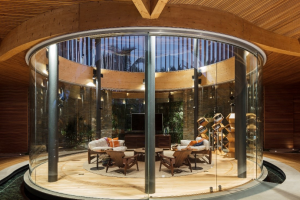 Além de um cilindro de vidro flutuando em meio aos jardins aquáticos, toda a residência é serpenteada longitudinalmente por uma grande varanda. São 700 m² entre sensações de abertura e fechamento, altos e baixos, formas e paisagens variadas em todas as direções.