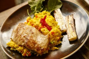 Prato principal: Peixe e palmito grelhados e flambados na cachaça, servidos com arroz, legume no dendê, leite de coco e gengibre
