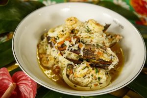 Prato Principal: Lambe lambe, tradicional prato caiçara com camarões e lula.