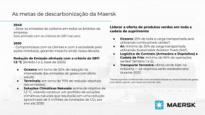 As metas incluem um compromisso social de ação imediata de modo a gerar impacto ainda nesta década, firmando um compromisso de fornecer cadeias de suprimentos “net zero” – ou seja, capazes de eliminar as emissões de carbono – até 2040. Isso vai além dos esforços anteriores para reduzir as emissões relacionadas à frota oceânica, pois abrange agora todas as emissões diretas e indiretas em todo o negócio da Maersk.