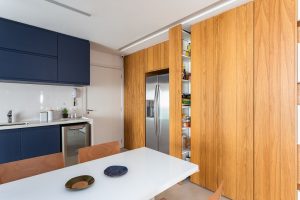 A lava-louças pode ser embutida, colocada em cima da bancada ou posicionada no chão entre um móvel e outro, como neste projeto feito pelo Studio Tan-gram | Foto: Estúdio São Paulo