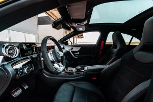Mantendo seu com compromisso com a esportividade e com a tecnologia, encontrada no sistema de infotainment MBUX, o interior dos novos modelos Mercedes-AMG A 45 S 4MATIC+ e Mercedes-AMG CLA 45 S 4MATIC+ apresenta alta qualidade e cria uma conexão pessoal e íntima entre homem e máquina. O condutor e o passageiro da frente ocupam posições ativas em assentos esportivos com contornos e com apoio lateral firme. O estofamento padrão, como uma combinação de ARTICO preto e microfibra DINAMICA (material usado na Fórmula 1 para aumentar a aderência), é atemporal e cria destaques típicos da AMG com costura dupla em vermelho. O esquema de cores é ecoado pelos cintos de segurança vermelhos designo e as saídas de ar cromadas com um anel vermelho.