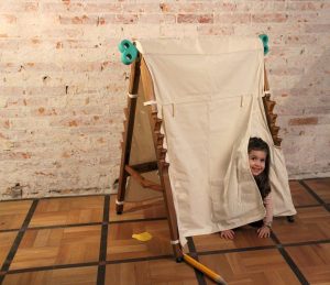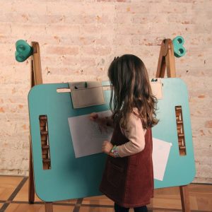 O móvel pode ser usado dos três aos 12 anos e é capaz de virar uma cabana e até mesmo uma lousa, além do formato original de prancheta, a partir dos encaixes das laterais. A ergonomia também foi pensada para atender às necessidades de usuários que precisam de cadeira de rodas.