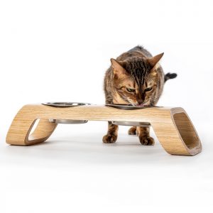 A altura do comedouro elevado é importante para que o gato não precise se abaixar para comer, mantendo seu esôfago acima da altura do seu estômago, o que diminui a chance de má digestão e refluxos. Além de preservar a coluna do bichinho e facilitar a alimentação sem a interferência dos seus bigodinhos sensíveis.
