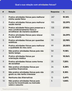 Considerando essa relação pessoal com as atividades físicas,51% dos entrevistados afirmam realizar exercícios para melhorar sua saúde física; 32% buscam melhorar a saúde mental; 28% procuram melhorar o condicionamento físico para envelhecer de forma mais saudável;26% praticam para relaxar ou se divertir; 23% se exercitam por questões estéticas, e 20% para melhorar a qualidade do sono. Quem não costuma realizar nenhuma atividade também tem seus motivos, com destaque para a falta de tempo, indicada por 11%; por questões financeiras, para 5%, ou por realmente não gostarem ou não terem interesse, citado por 5% dos perguntados.