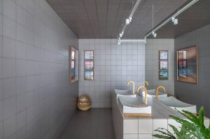 O projeto acima, do escritório Esquadra Arquitetos, foi inspirado na volumetria cromática do arquiteto mexicano Luis Barragán para criar um espaço muito atual, focado no relaxamento extremo e no design contemporâneo. As “grades”, formadas pelo revestimento Twenty Deluxe da Decortiles, estão por toda a parte desde a bancada, até o piso, teto e paredes. O tom Rose Gold reveste a parede principal criando um painel que se destaca pela tonalidade e torna a volumetria suave das peças ainda mais encantadoras.