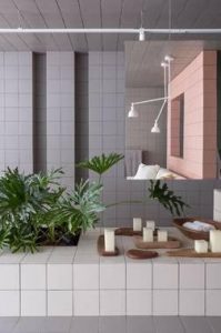 Utilizado com boas inspirações e ideias é possível aplicar a geometria “grid” em cozinhas, salas de banho e até mesmo em bancadas, como no caso da imagem acima que acomoda um pequeno jardim. Revestida com o padrão Nude, a peça resgata a tranquilidade e beleza dos tons claros em uma aplicação com personalidade e cheia de criatividade.