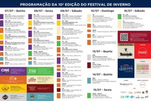 A programação completa da 10ª edição do Festival de Inverno do Centro Histórico, com valores, endereços e horários das atrações pode ser consultada no site: https://www.centrohistoricodecuritiba.com.br/wp-content/uploads/2022/07/af_backdrop_programacao_300x200cm.pdf