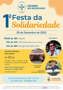 No sábado, dia 3 de dezembro, o Lar dos Idosos Recanto do Tarumã será palco da 1ª Festa da Solidariedade Socorro aos Necessitados, organizada por um grupo de voluntários da instituição
