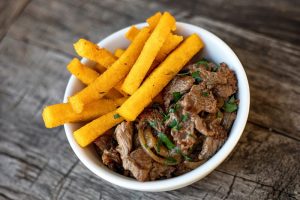Entrecot acebolado com polenta: filé de entrecot com molho acebolado e acompanhado por polenta. O prato será oferecido pela Giordani Gastronomia, que terá no cardápio outras comidas típicas como galeto desossado com polenta.