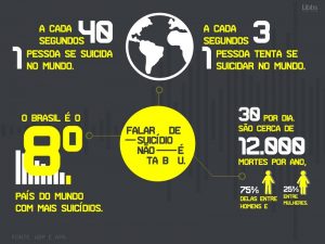 O assunto é sério – o Brasil é o oitavo país do mundo em número de suicídios. São cerca de 12 mil por ano, em média 32 pessoas se matam por dia no Brasil, se tornando a terceira maior causa de morte entre jovens. No mundo, mais de 800 mil pessoas se suicidam anualmente e esse número não para de crescer.