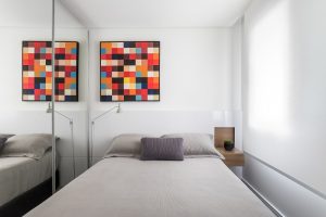 O quarto de 9,20 m² ganha sensação de amplitude com a utilização do espelho. Projeto: UNIC Arquitetura | Fotos: Eduardo Macarios