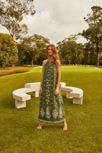 Os bordados criados a partir de desenhos de aquarela no ateliê da marca são um dos pontos altos desta coleção e aparecem em diferentes propostas. Os vestidos de algodão estruturados, seja no azul laguna com manga ¾ e cintura marcada ou no verde jacarandá de alça com modelagem mais solta ganham detalhes de lurex com referências de elementos ornamentais e ilustrações de paisley. A versão azul aparece também na calça mais soltinha, perfeita para ser usada com uma camisa e uma rasteira sem salto.