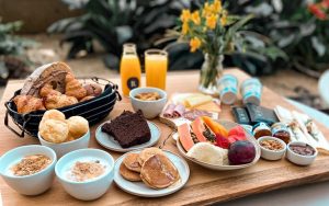 Para os casais que querem presentear sem sair de casa, a aposta fica para a Cesta de Café da Manhã do Renaissance São Paulo Hotel, repleta de: panquecas artesanais, pão de queijo, tábua de queijos e frios; mini bolo, iogurte, granola, Bircher Muesli (também conhecida como granola suíça, feita com com leite, aveia, banana, banana passa e melado de cana com iogurte), morangos com chocolate, salada de frutas frescas da estação, frutas secas, mel, manteigas, geleias, cream cheese e Nutella. O presente acompanha, ainda, cesta de pães com muffins de cenoura com chocolate, croissants recheados, Levain, café pessegueiro (drip coffee), suco integral e uma garrafa de Freixenet (R$ 350,00/ serve duas pessoas).