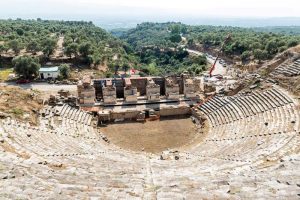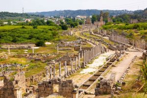 Perge é uma antiga cidade romana proeminente nas terras da Anatólia, sendo uma das cidades mais ricas do velho mundo. Já teve a identidade de uma metrópole e, por conta disso, várias esculturas de assinatura foram encontradas na região durante escavações. No museu a céu aberto de Perge, é possível encontrar um portão monumental, estádio, teatro antigo, ruas com colunas, hammam e a estátua do deus do rio Kestros.