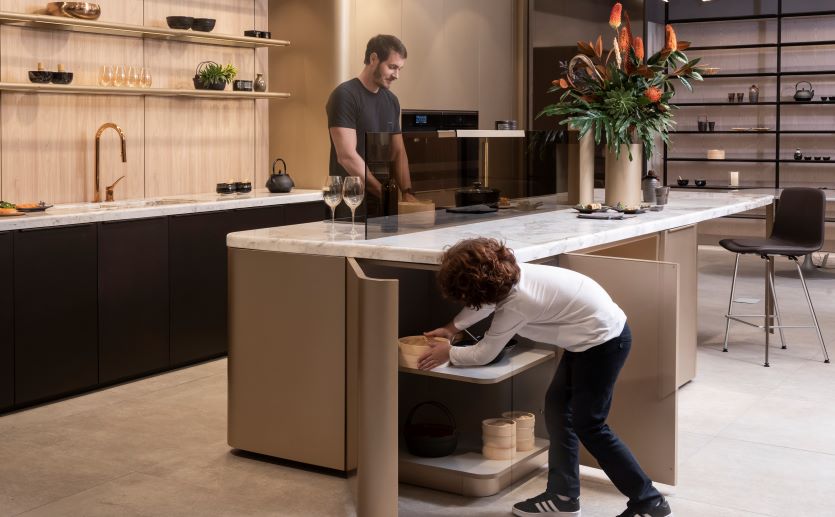 Já Vivian Coser trouxe para a Move um DNA dinâmico e único, capaz de garantir infinitas composições como painel de múltiplos orifícios, nos quais se fixam ganchos, nichos, prateleiras, gavetas, entre outros itens. Com total autonomia, o cliente pode personalizar, acrescentar ou mudar a configuração das peças ao longo do tempo e até migrar o painel para outros ambientes da casa.